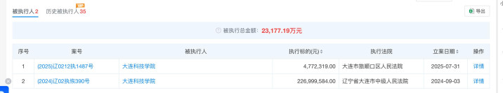 大连科技学院2条被执行人信息,总金额超2.3亿元。