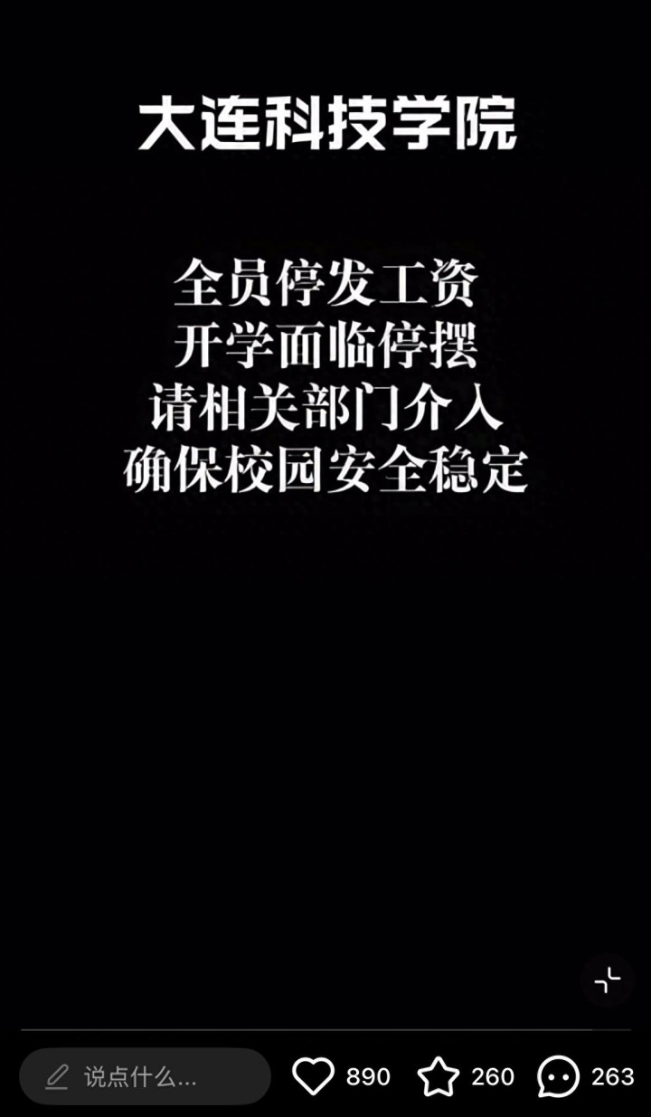 近日,有网友发帖称“大连科技学院全员停发工资,开学面临停摆”,引发关注。在帖文评论区,记者注意到有一封落款为“大连科技学院工会委员会”的《致全体教职员工一封信》。信中提到,在未收到任何法律文书和通知的情况下,学校各类相关账户被大连市中级人民法院冻结,致使7月工资未能如期发放。学校工会将为全体教职员工发放临时困难补贴和慰问补贴。